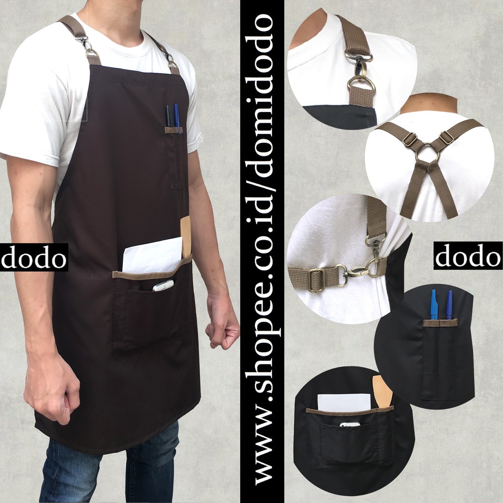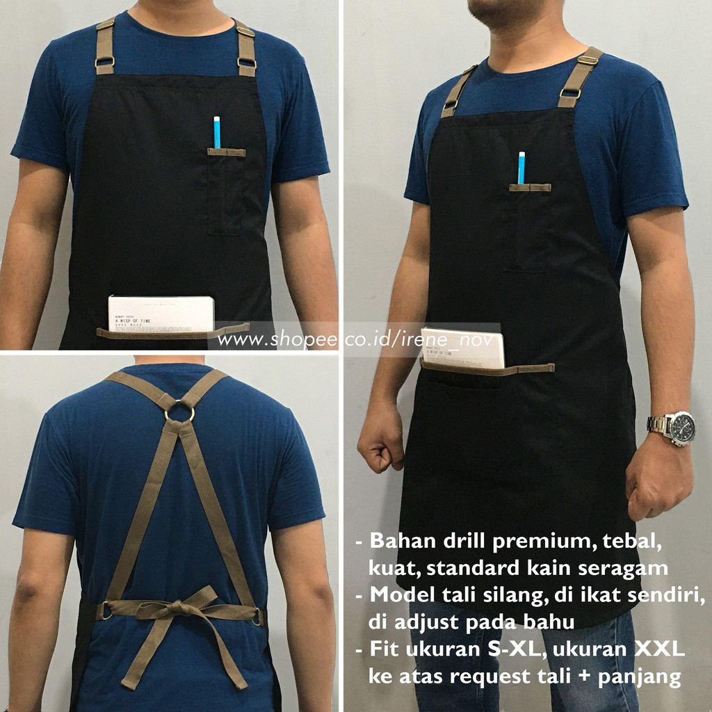 Apron barista shopee. - 2 kantong besar untuk tablet nota catatan uang dll - 3 kantong kecil berada di dpn slh satu kantong besar untuk bolpen testpen gunting hp spidol kalkulator dll - 1 ring besi untuk. 81 64 cm all size bisa untuk yang gemuk juga kurus unisex Tersedia warna hitam coklat merah. As picture show Material.